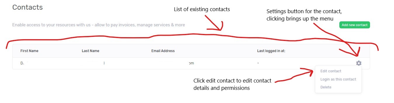 4. If you are managing the PRIMARY account contact, you will be taken to a screen like the top image shown below which will provide an overview of the current account owner profile. Near the bottom, you will see the currently associated list of additonal authorized email addresses. At the top, there will be a horizontal navigation bar that includes an option for "Edit Details". Clicking on that option in the horizontal navigation bar will take you to a screen that allows you to edit the PRIMARY account owner details. If you are looking to manage the details of a secondary account contact and have clicked on the "manage contacts" option in step 3, you will be taken to a screen like that shown on the bottom. To the left of each existing contact on your account there will be a gear image. Clicking on the gear image will bring up a menu that will contain an option for "edit contact". Clicking on edit contact will bring you to another screen that will allow you to edit the details for that contact on your account.